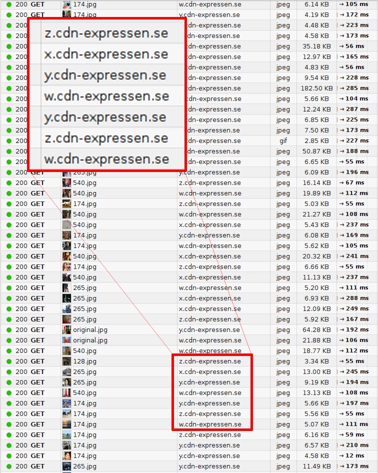 The image below shows what a packet trace looks like when browsing one of Sweden's top web sites and how requests are distributed over several host names.