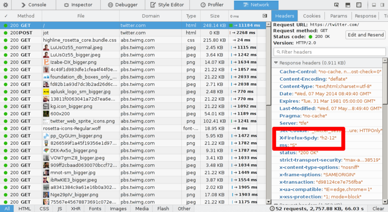 No existe ningún elementos en la interfaz de usuario que nos diga que se está hablando http2. No es fácilmente detectable. Un modo de averiguarlo es activar “Web developer->Network” y comprobar las cabeceras de respuesta para ver que está enviando el servidor. La respuesta será entonces “HTTP/2.0” y algo más. Firefox inserta su propia cabecera denominada “X-Firefox-Spdy:” como se aprecia en la captura de pantalla de arriba. Las cabeceras que se ven en la herramienta de red al utilizar http2 han sido convertidas desde el formato binario de http2, para parecerse al estilo clásico de las cabeceras de HTTP 1.x.No existe ningún elementos en la interfaz de usuario que nos diga que se está hablando http2. No es fácilmente detectable. Un modo de averiguarlo es activar “Web developer->Network” y comprobar las cabeceras de respuesta para ver que está enviando el servidor. La respuesta será entonces “HTTP/2.0” y algo más. Firefox inserta su propia cabecera denominada “X-Firefox-Spdy:” como se aprecia en la captura de pantalla de arriba.