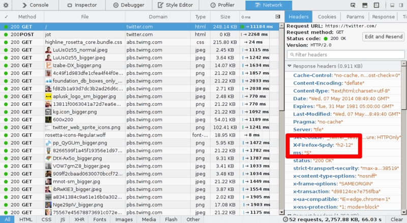 Não existe nenhum elemento de interface que indique que você está "falando" http2. Não é possível dizer facilmente. Uma forma de descobrir é habilitando o modo "Web developer -> Network" e verificar os cabeçalhos de resposta recebidos do servidor. A resposta é “HTTP/2.0” e o Firefox adiciona seu próprio cabeçalho chamado “X-Firefox-Spdy:”, como mostra a imagem acima.
